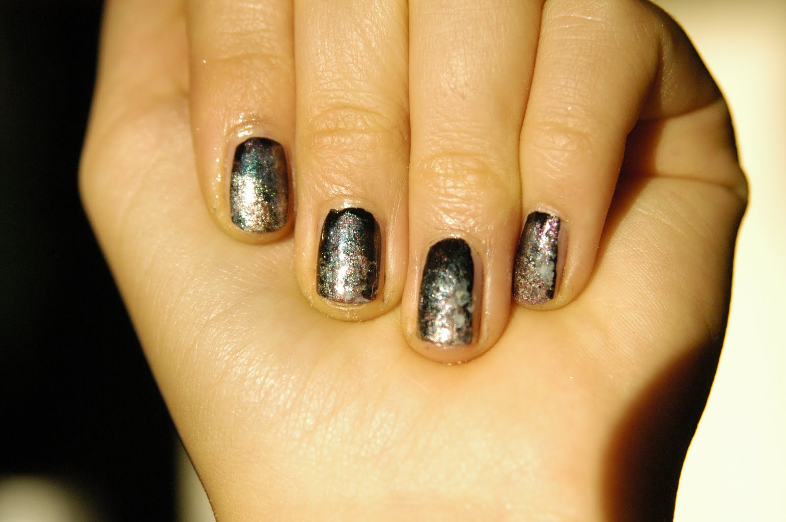Als Grundton habe ich ein Schwarz gewählt, nachdem dieses getrocknet war, habe ich mithilfe des Zewas (Nagellack auf Zewa, Zewa auf Fingernagel) verschiedene Farbtöne auf den Nagel getupft. Ich habe mich für ein schimmerndes Blau, ein Hellgrau, ein metallisches Rot, ein grünlicher Silberglitzerlack und ein Perlmutt mit Opalsplittern entschieden. Anschließend einen Topcoat auftragen, je nach Belieben für Glanz oder einen matten Effekt. Et voila!